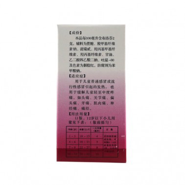 ¹¦ÄÜÖ÷ÖΣºÓÃÓÚ¶ùͯÆÕͨ¸Ðð»òÁ÷ÐÐÐÔ¸ÐðÒýÆðµÄ·¢ÈÈ¡£Ò²ÓÃÓÚ»º½â¶ùͯÇáÖÁÖжÈÌÛÍ´£¬ÈçÍ·Í´¡¢¹Ø½ÚÍ´¡¢Æ«Í·Í´¡¢ÑÀÍ´¡¢¼¡