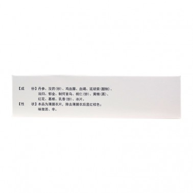 | 成分 | 丹参、没药(炒)、鸡血藤、血竭、延胡索(醋制)、当归、郁金、制何首乌、桃仁(炒)、黄精(蒸)、红花、葛根、乳香(炒)、冰片。 |