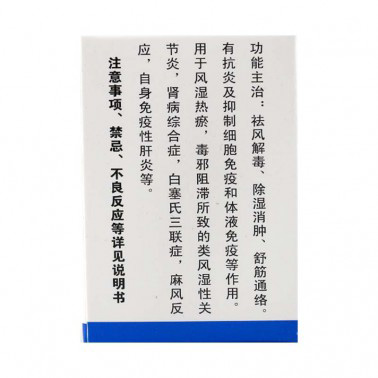 ¹¦ÄÜÖ÷ÖΣºìî·ç½â¶¾¡¢³ýʪÏûÖס¢Êæ½îͨÂç¡£Óп¹Ñ×¼°ÒÖÖÆÏ¸°ûÃâÒߺÍÌåÒºÃâÒßµÈ×÷Óá£ÓÃÓÚ·çʪÈÈðö£¬¶¾Ð°×èÖÍËùÖµÄÀà·çʪÐԹؽÚÑ×£¬Éö²¡×ÛºÏÖ¢£¬°×ÈûÊÏÈýÁªÖ¢£¬ Âé·ç·´Ó¦£¬×ÔÉíÃâÒßÐÔ¸ÎÑ׵ȡ£