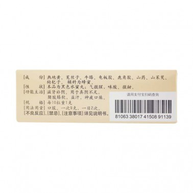 | ³É·Ö | ÊìµØ»Æ¡¢ÝËË¿×Ó¡¢Å£Ï¥¡¢¹ê¼×½º¡¢Â¹½Ç½º¡¢É½Ò©¡¢É½ÜïÝÇ¡¢èÛè½×Ó¡£¸¨ÁÏΪ£º·äÃÛ¡£ |